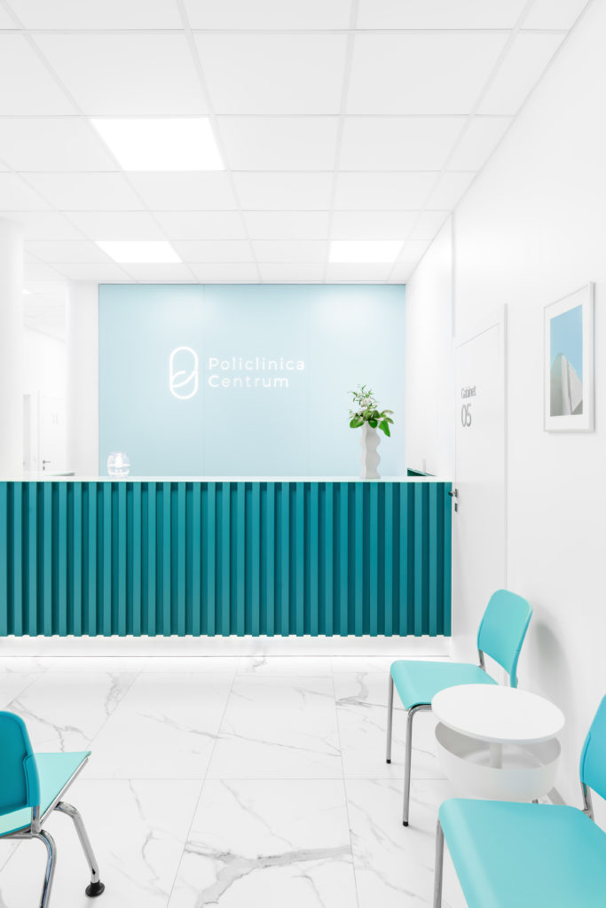 Policlinica Centrum zajmuje powierzchnię ponad 300m2 i składa się z 5 gabinetów lekarskich, w pełni wyposażonej sali operacyjnej, łazienek dla pacjentów i personelu oraz przestronnej i reprezentacyjnej recepcji, gdzie pacjenci oczekują na swoje wizyty. Oprócz tego, w głębi, nieco bardziej ukryte znajdują się także kuchnia i szatnia z niezbędnymi udogodnieniami dla personelu kliniki.