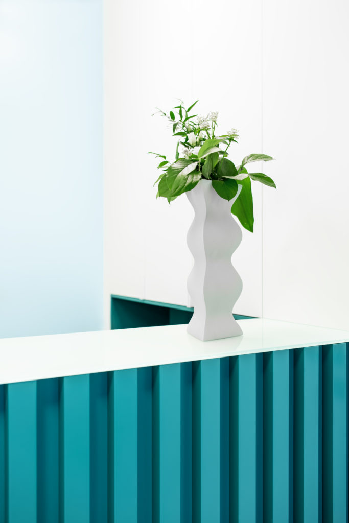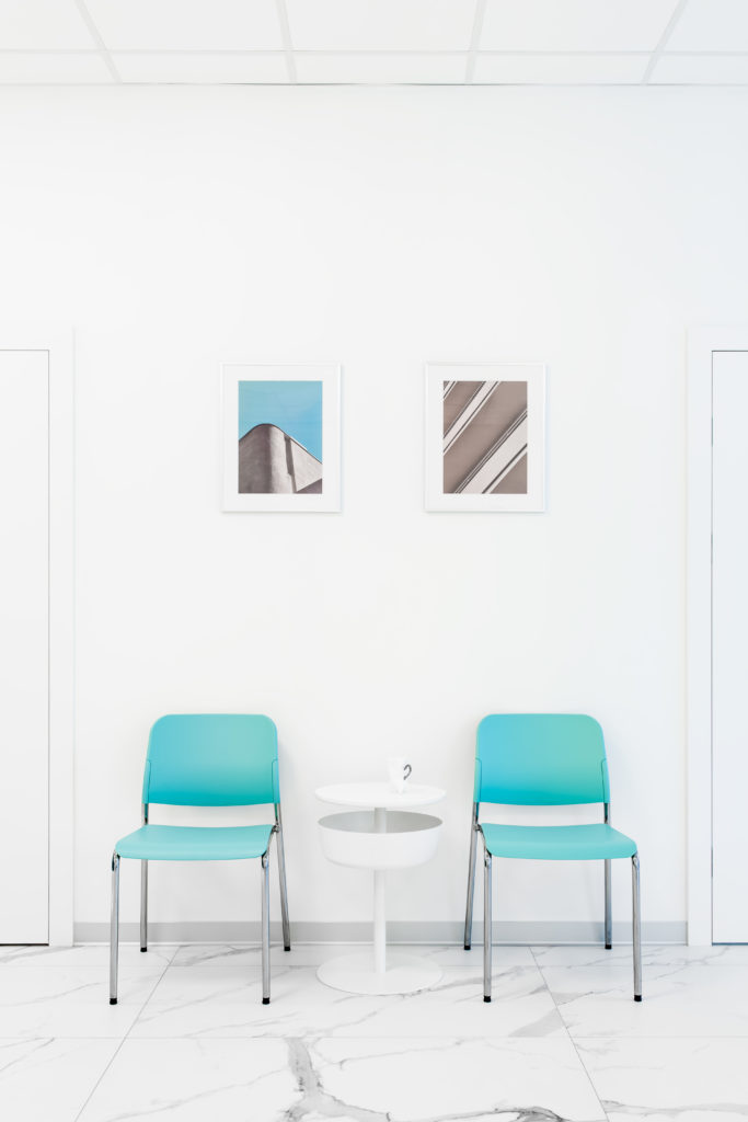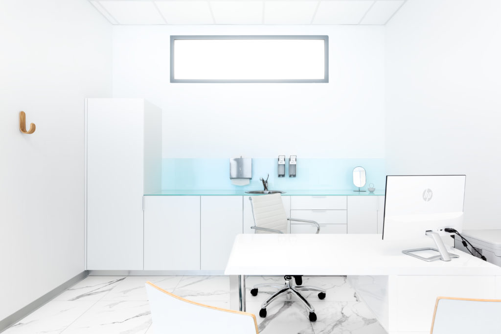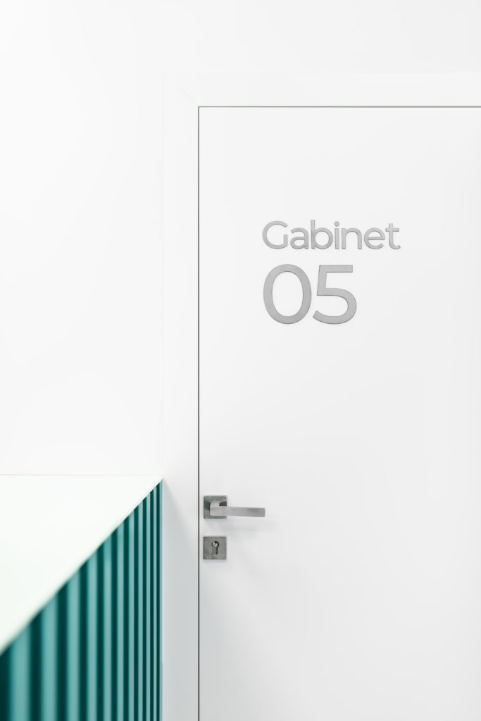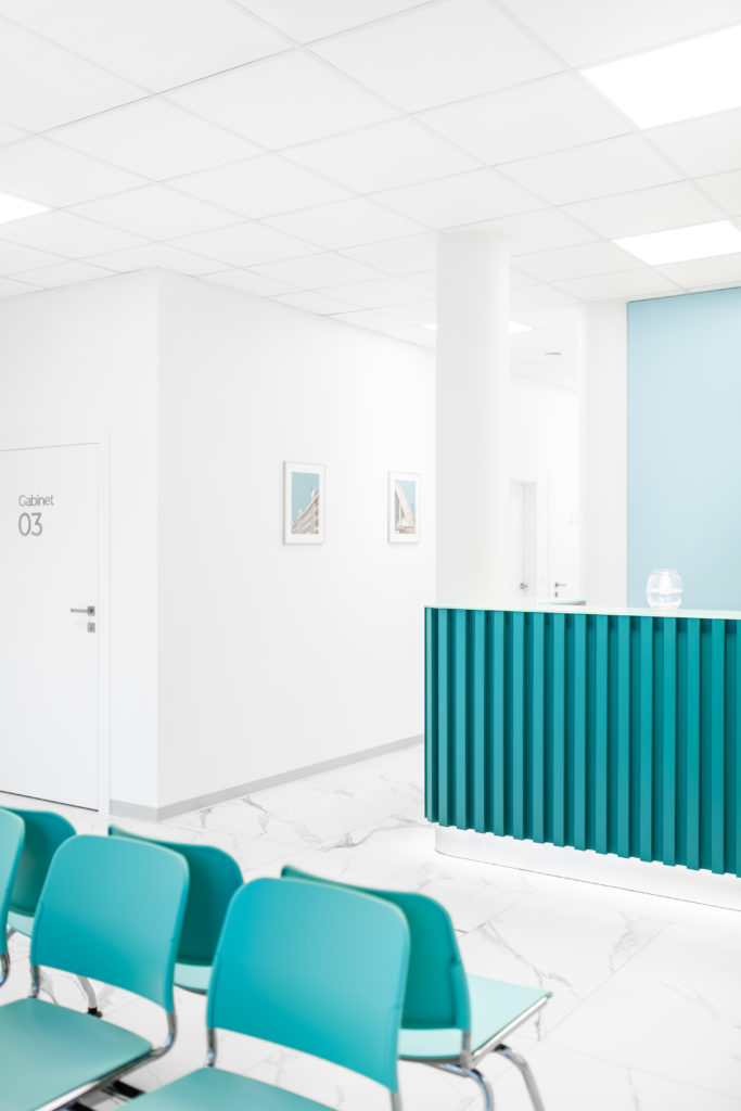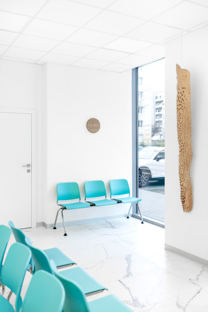 Paleta kolorów obraca się wokół wielu odcieni morza - głębokiego turkusu, różnych odcieni błękitu, a także kojących bieli i melancholijnych szarości. Ryflowany i pięknie wykończony blat recepcyjny są hołdem dla stałego rytmu fal i ich kojącego działania, podczas gdy wiele elementów, takich jak wazon czy drewniana rzeźba przy wejściu wykonana przez zdolnych polskich projektantów, nadaje klinice lokalny klimat. Tę całość dopełnia kolekcja fotografii prezentujących piękno architektury Gdyni, wykonanych przez członka zespołu, Małgorzatę Szczurowską.